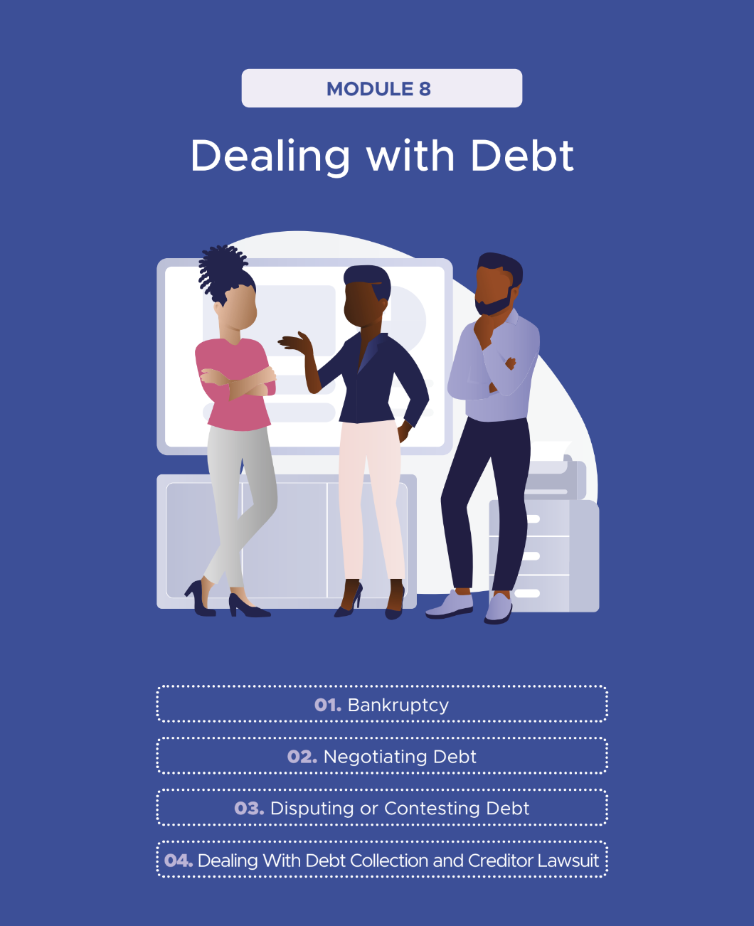 This session covers bankruptcy, how to negotiate, dispute, or contest debt, and handling debt collection and creditor lawsuits.
